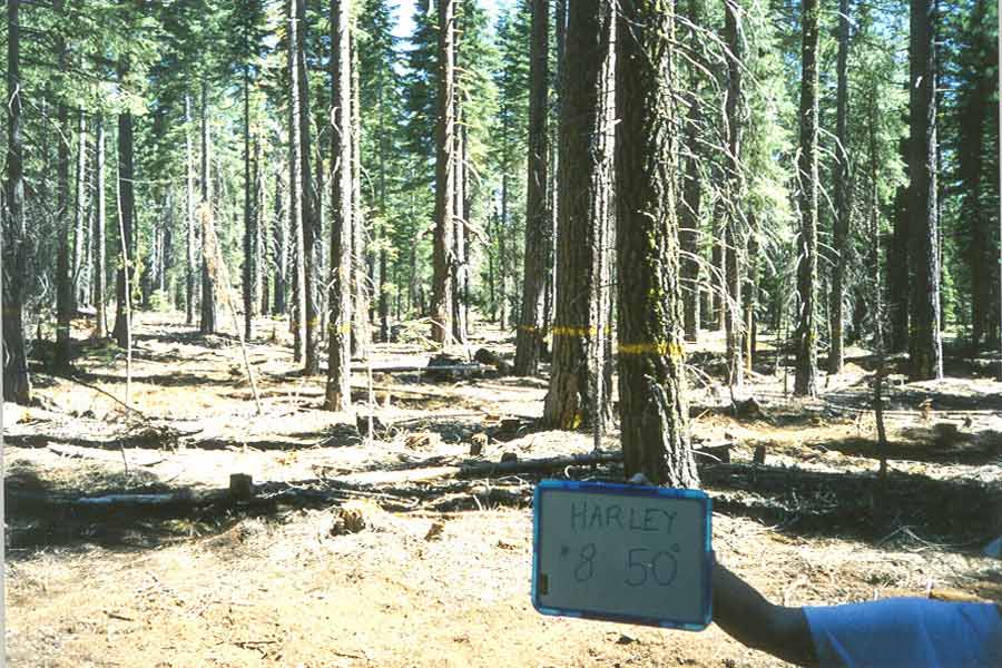 This stand was mechanically treated with a timber sale embedded within a service contract. The pre-thinning photo (#5) shows that the stand consisted of scattered, large, overstory pine with a dense understory of white fir. It was a typical case of white fir encroachment due to fire suppression and exclusion. The prescription was to thin the pine from below to a 16 inch upper diameter limit and remove all white fir up to a 24 inches upper diameter limit. The objective was to enhance the old-growth by improving the health and vigor of the residual pine and remove most of the encroaching white fir. This project cost $129 per acre to accomplish and met the intended objective.